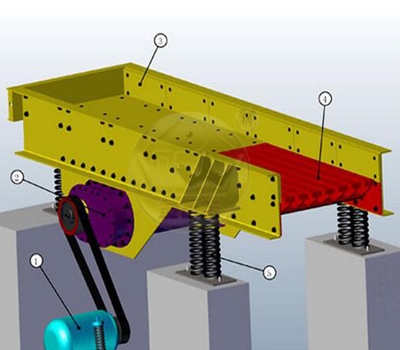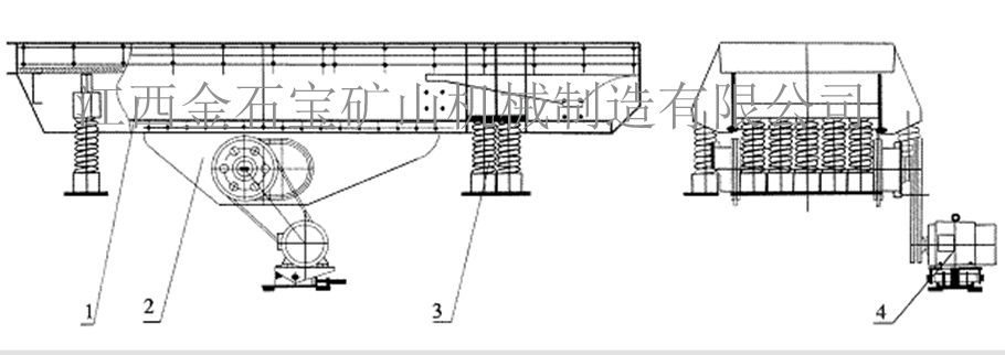 1. 振动机架(给料槽);2. 激振器;3. 减震弹簧及支座;4. 电机及支座